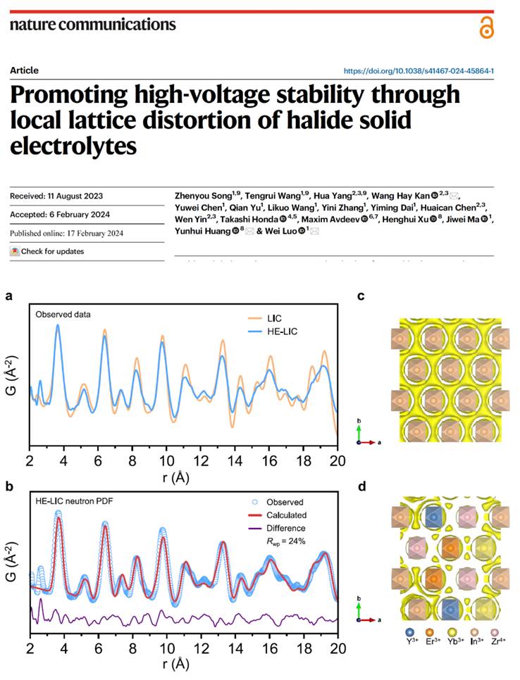 无机类固态电解质是实现高安全性和高比能固态电池的关键材料。无机材料中离子的迁移和耐氧化能力受到材料局部结构的影响,鉴于不同金属离子尺寸的差异,det365登录网站主页材料学院车用新能源研究团队与中国科学院高能物理研究所简宏希等人合作通过在晶格中引入不同离子来对局部结构进行调整,有效提升了固态电解质材料的离子电导率及电化学稳定性。研究成果以“Promoting high-voltage stability through local lattice distortion of halide solid electrolytes”和“Local structural features of medium-entropy garnet with ultra-long cycle life”为题分别发表于《自然·通讯》 (Nature Communications)和《物质》(Matter),det365登录网站主页博士生宋振友和陈雨薇为这两篇论文的第一作者。